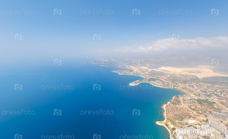 Вид с воздуха извилистой средиземноморской береговой линии, простирающейся к горизонту, бирюзовое море встречает золотые берега, далекие облака над горами Телец