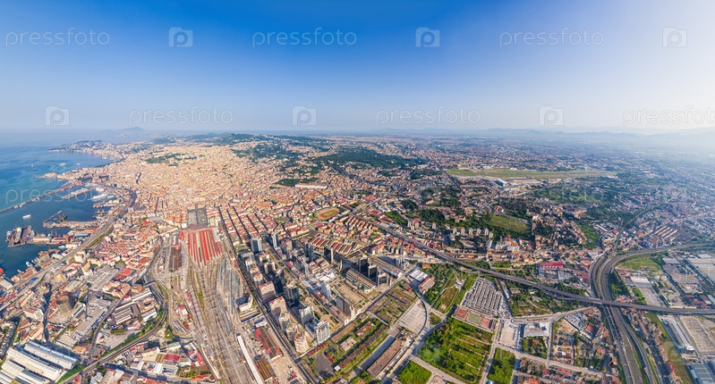 Неаполь, Италия. Железнодорожный вокзал - Napoli Centrale. Centro direzionale является деловым районом Неаполя. Панорама города в летний день. Солнечная погода. Вид с воздуха