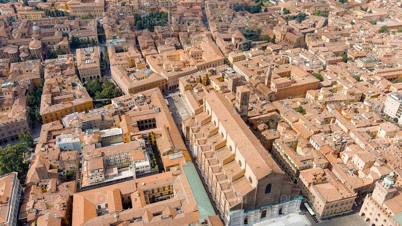 Болонья, ИталияСтарый городБазилика Сан-ПетрониоПанорамный вид на городЛето, Aerial View