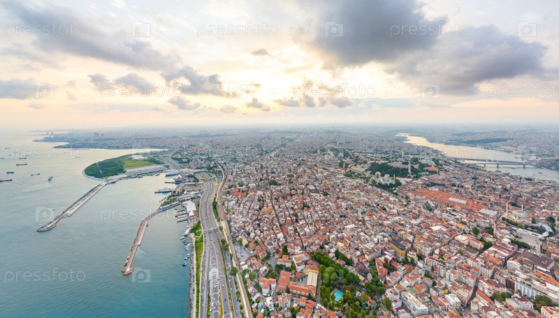 Стамбул, Турция. Исторический центр города. Набережная. Босфор и район Фатих. Облачная погода на закате солнца. Вид с воздуха