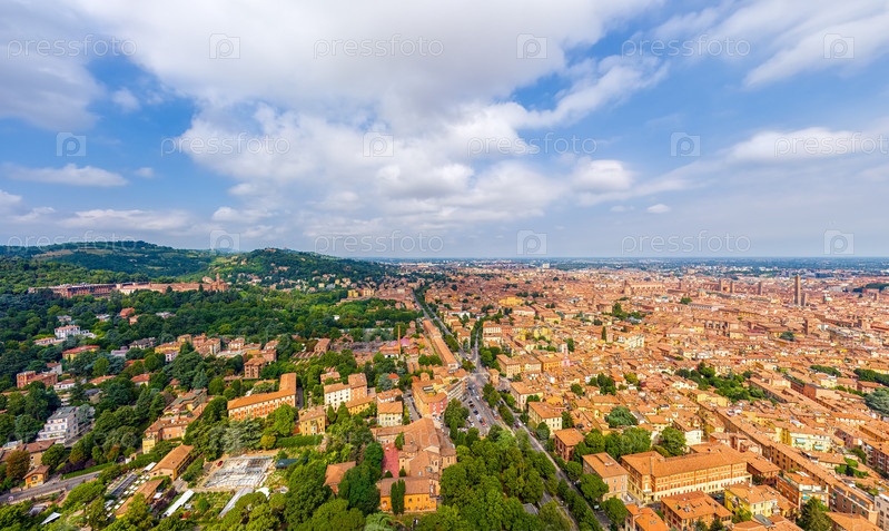 Болонья, Италия Исторический центр Панорама города в летний день Солнечная погода Вид с воздуха