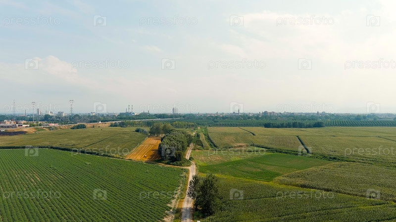 Пьяченца, Италия.Полет в сторону города над полями.Река По, Aerial View