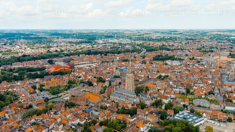 Брюгге, Бельгия Церковь Богоматери - готическая церковь XIII века Панорама на центр города с воздуха Облачная погода, летний день, Aerial View