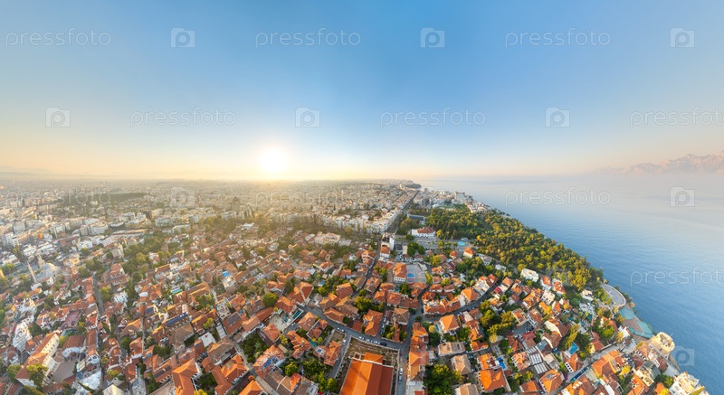 Расширенная летняя утренняя панорама дрона с очаровательным старым городом Калейчи, ведущая к яркой береговой линии с морем и современным городским фоном
