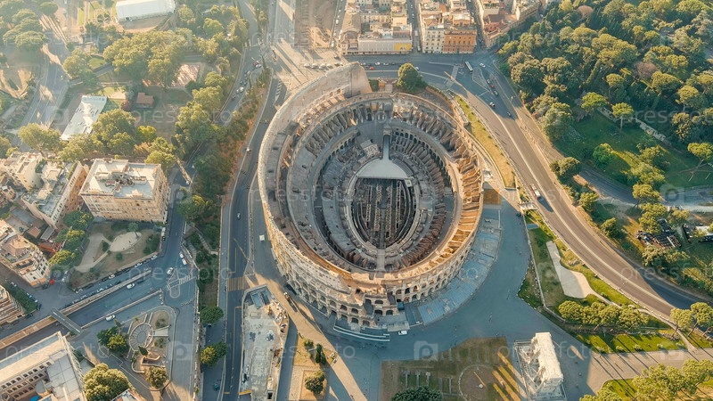 Рим, Италия. Римский Колизей. Полет над городом. Панорама города утром. Летом Aerial View