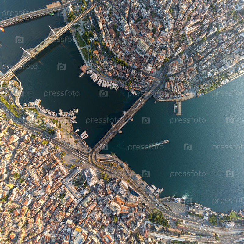Сверху вниз вид Галата моста над Золотым Рогом, Босфорским проливом, Мостом метро Халик и районами свыше