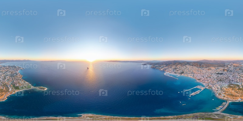 Кусадаси, Турция - 4 июля 2025 года: сферическая панорама на закате. круизный лайнер отплывает в солнце блестит по воде. яхта-марина, порт, пляжи, прогулка. Панорама 360х180. вид с воздуха