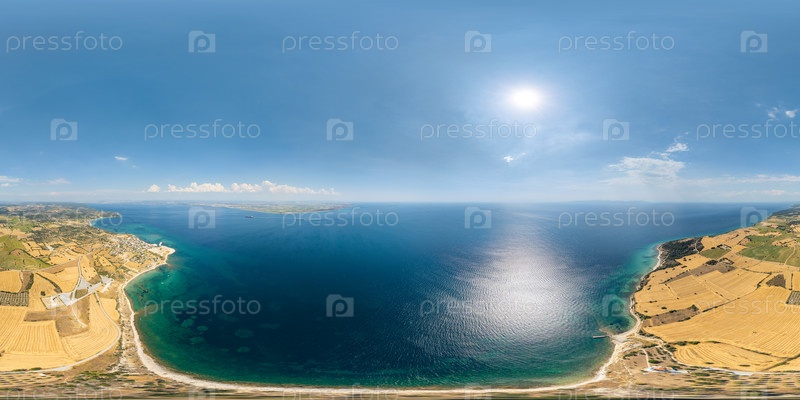 Сферная панорама 360x180 мыса Хелес на полуострове Галиполи, вход в Дарданелльский пролив из Эгейского моря с маяком Мехметчика