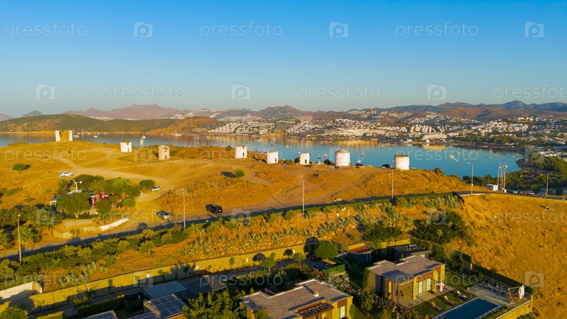 Утренний взгляд с беспилотного летательного аппарата на исторические ветряные мельницы Бодрума на холме с заливом Гокова в фоне под ярким летним солнцем