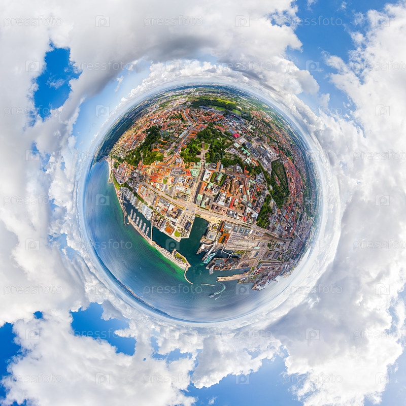 Хельсингборг, Швеция. Панорама города летом с портовой инфраструктурой. Оресунский пролив. Днем. 360-градусный воздушный панорамный астероид