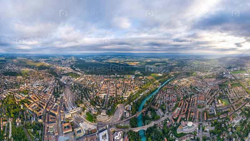 Берн, Швейцария.Панорама города в пасмурную погоду.Солнечные лучи.Летнее утро.Вид с воздуха