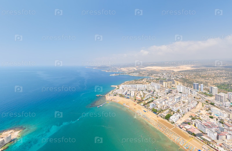 Вид с воздуха узкого пролива между островом Девственный замок и материком, золотые песчаные пляжи, скалистый полуостров и бирюзовое Средиземное море