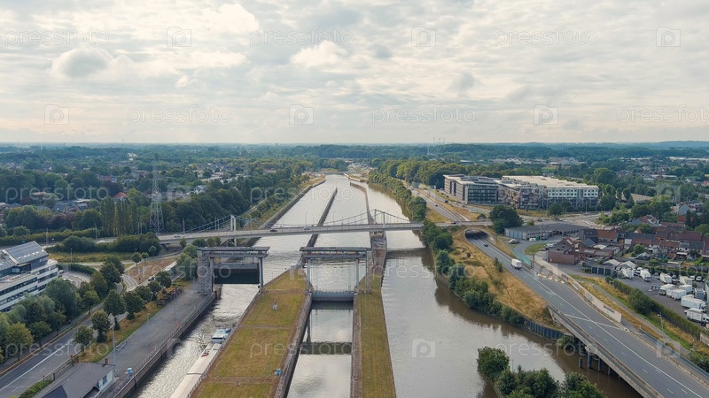 Гент, Бельгия. Ringvaart in Ghent - водный канал. Sluis Merebeke - достопримечательность, ворота к каналу Рингварт-Гент в городе Меребеке, вид с воздуха