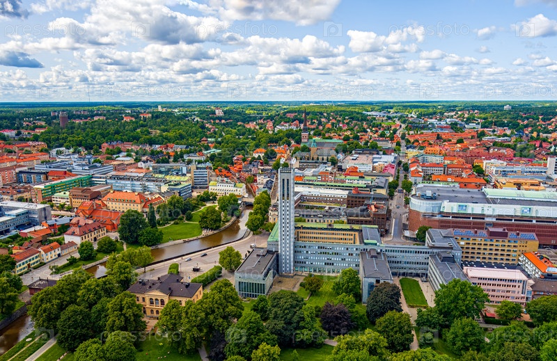 Вастерас, Швеция. Ратуша. Панорама города летом в пасмурную погоду. Вид с воздуха