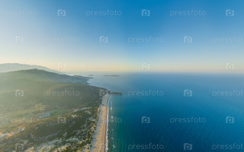 Пляж Патара и Средиземное море утром, летняя береговая линия с волнами и песком в панорамном виде сверху