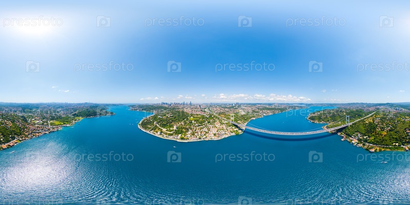 Стамбул, Турция Мост Фатиха султана Мехмета - это подвесный мост через Босфорский пролив между Европой и Азией Летний солнечный день Панорама 360 x 180