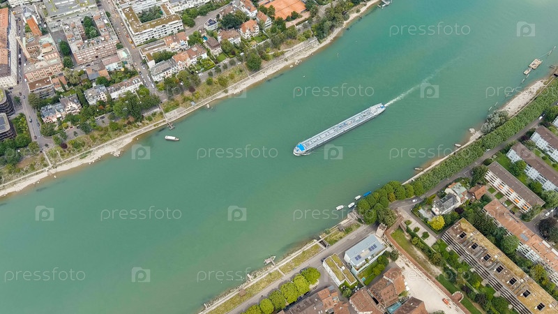 Базель, Швейцария.Танкерная грузовая баржа плывет вдоль реки Рейн.Базел - город на реке Рейне в Швейцарии, недалеко от границ с Францией и Германией, Aerial View