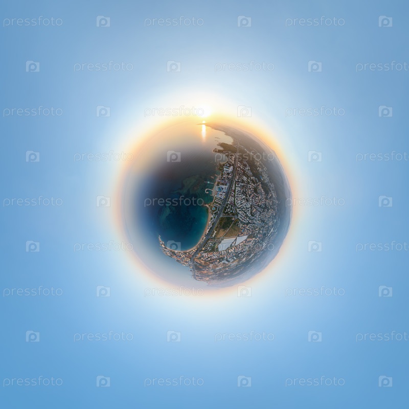 Авсаллар, Аланья, Турция.Маленькая планета взглянуть с воздуха на береговую линию Средиземного моря с пляжами, отелями и горами кружат над горизонтом.Панорамный астероид 360 градусов