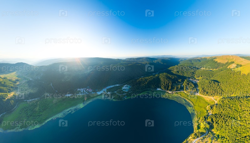 Абант - большое пресноводное озеро, окруженное горами и лесом с живописным видом. время захода солнца. летний пейзаж. вид из воздуха