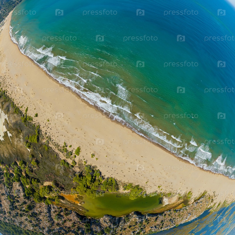 Перспектива из воздуха сверху вниз береговой линии пляжа Изтузу, показывающая действие волн и образцы осадков на золотом песке