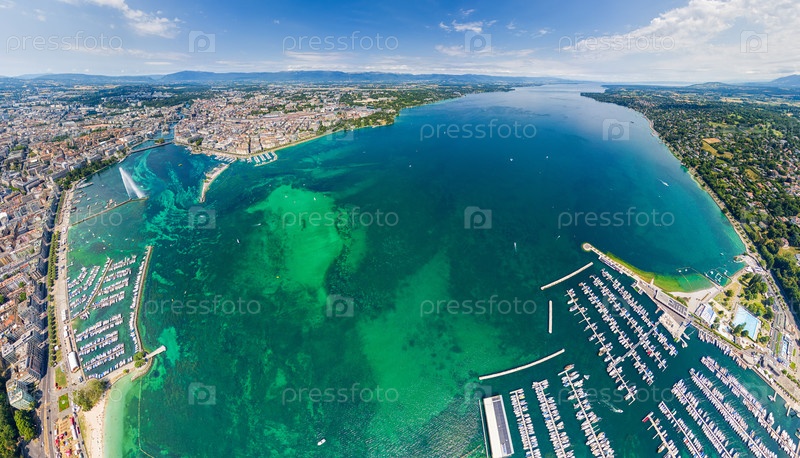Женева, Швейцария. Фонтан Дже-Дэу. Женевское озеро. Панорама летом. Вид с воздуха
