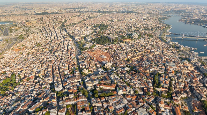 Панорамный вид из воздуха на центр города с акцентом на Большой Базар и крыши района Фатих