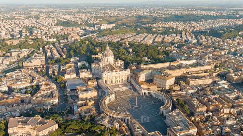 Рим, Италия. Вид на Ватикан. Базилика Сан-Пьетро, Пьяцца Сан-Пьетро. Полет над городом. Утренние часы, Aerial View