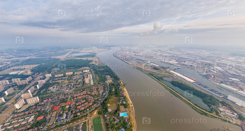 Антверпен, Бельгия. Панорама города. Река Шелда (Эскаут). Летнее утро. Вид с воздуха
