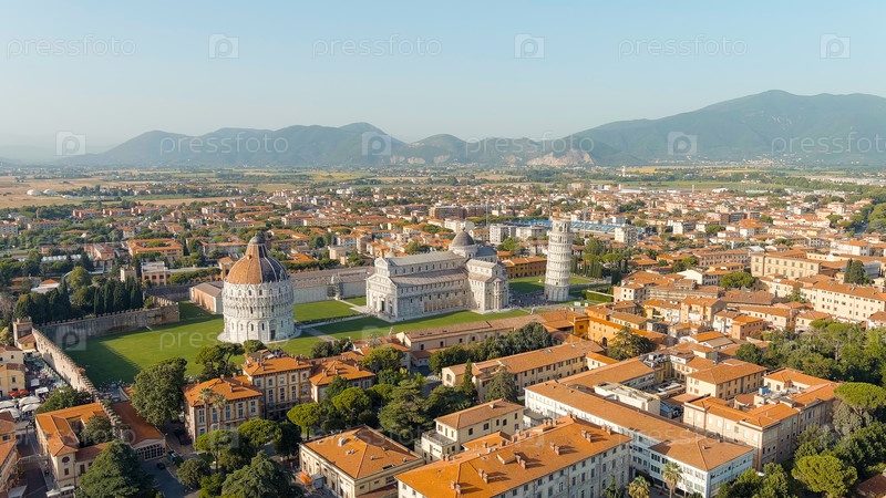 Пиза, Италия. знаменитая наклонная башня и пизанский собор в Пьяцце-дей-Мираколи. лето. вечерние часы, взгляд с воздуха