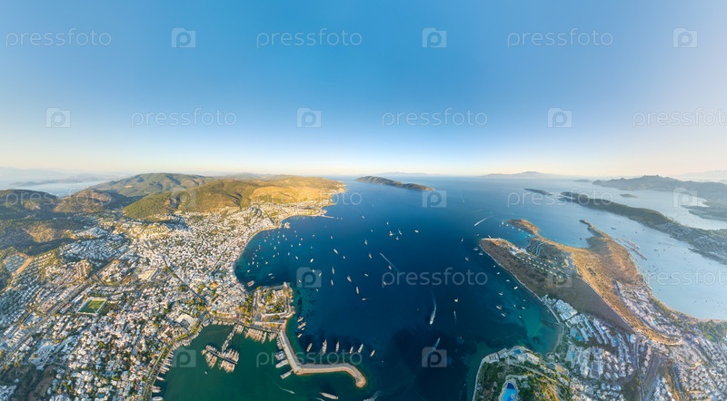 Панорама захода солнца яхт-марина, белые дома с плоской крышей, замок Бодрум, пляжи, яхты, древний театр и городские стены Галикарнасса