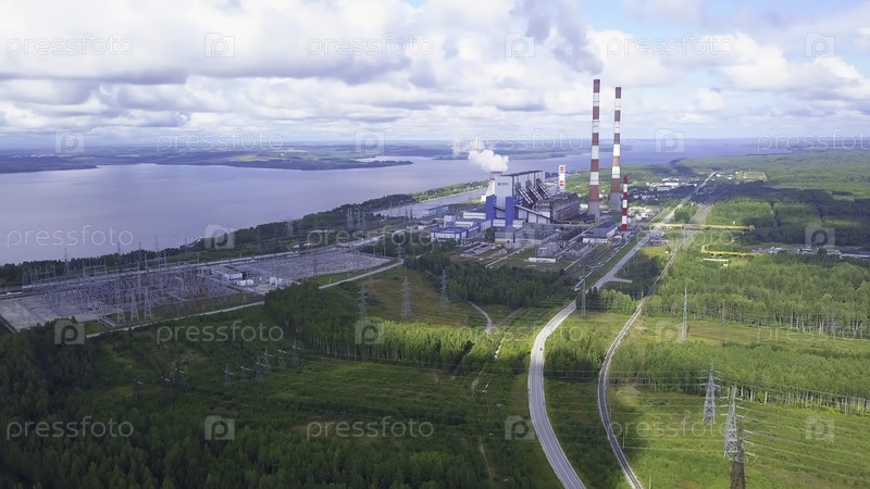 Вид сверху промышленного сооружения с фабриками в летний день. Клип. Прекрасный пейзаж с промышленной зоной возле поселения в солнечный летний день. Горизонт с панорамой индустриальной зоны на лесном зеленом участке