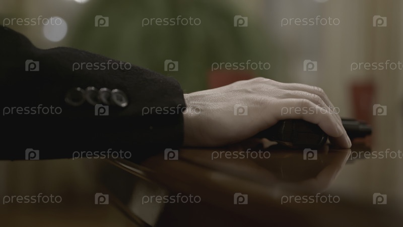 Мужчина держит пистолет на столе и угрожает Преступник грозит оружием за столом переговоров