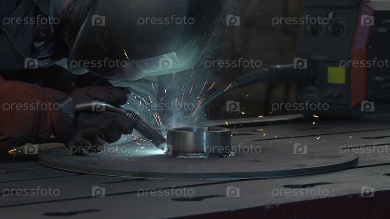 Маскированный работник сварляет металлические конструкции.Креативное.Сварочные искры летают во время работы сварщика на промышленном заводе.Маскированный сварщик работает с опасной сваркой в оборудовании