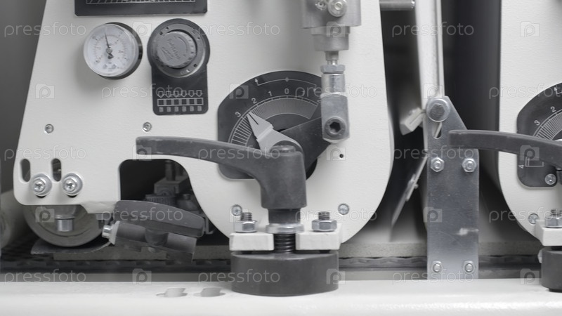 Близкий снимок конвейерной машины с индикатором давления.Креативность.Перемещение конвейерной линии под давлением.Производство резины на конвейере