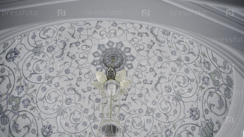 Декоративный потолок в форме купола с голубым цветочным узором. Сцена. Висящая маленькая люстра, вид снизу