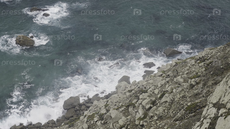 Волны, движущиеся по скалистому берегу красивого моря. Действие. Бирюзовое море с белыми волнами с скалистым берегом. Путешествия, моря и южные страны