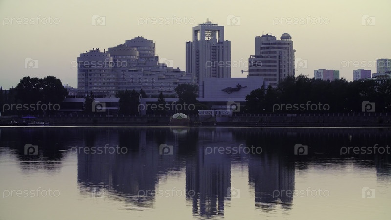 Сумеречный городской пейзаж с современной архитектурой отражается в спокойных водах, захватывая всех зрителей
