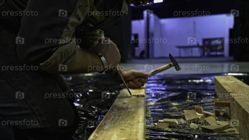 Ближайшее изображение рабочего, использующего инструменты для проделания отверстий в деревянной балки. СМИ. Работы по плотничеству для изготовления украшений