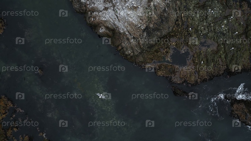 Вид сверху летающих чайков на скалистом побережье. Клип. Великолепные скалы и рифы с летящими чайками в море. Морской пейзаж северного побережья с чайками и скалами