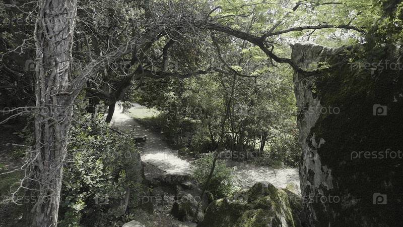 Вид на тропу в зеленом лесу с деревом и скалой. Действие. Сухое дерево с небольшим камнем в зеленом солнечном лесу. Таинственный зеленый лес со дорожкой и булыжниками в солнечный день
