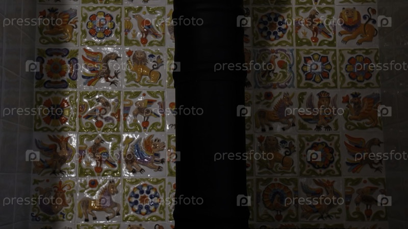 Близкий снимок печи нагреватель дров внутри квартиры с белыми небольшими плитками с животными и цветами позади. креативное. старомодная домашняя духовка
