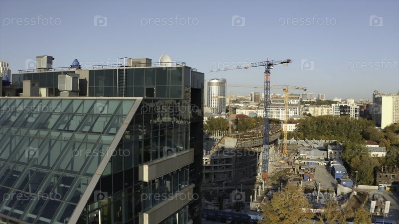 Современное высотное здание на фоне строительства стадиона. Скриншоты. Вид на современный город с многоэтажками и стройкой стадиона. Городской ландшафт с современными высотами и стройкой