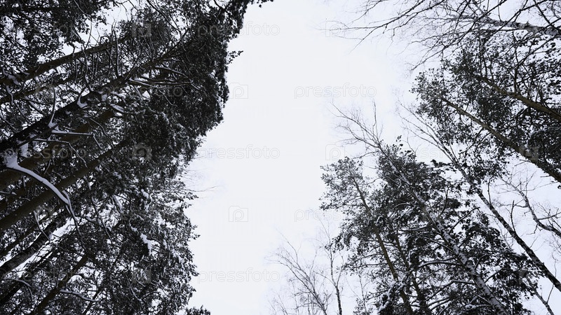 Стволы и вершины высоких сосен в зимнем снежном лесу на фоне облачного неба. СМИ. Вид снизу вверх в пасмурный ветреный день