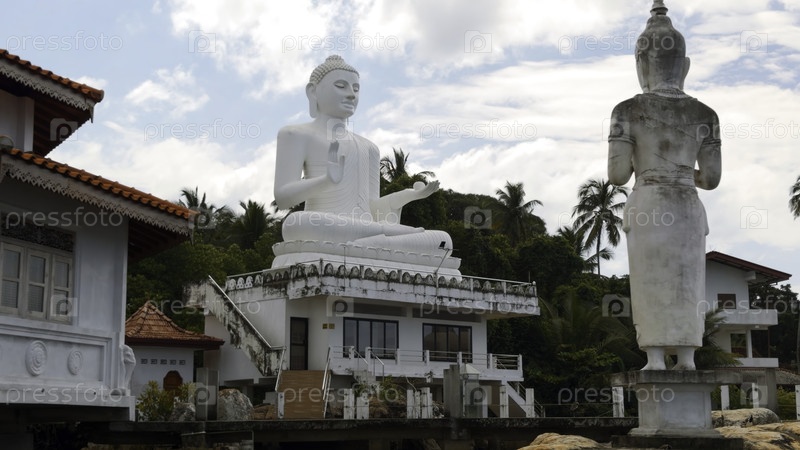 Статуи Будды в речной деревне.Действие.Статуи Белого Будды в тропической речной деревне.Прекрасные белые статуи Будды на берегу тропической реки