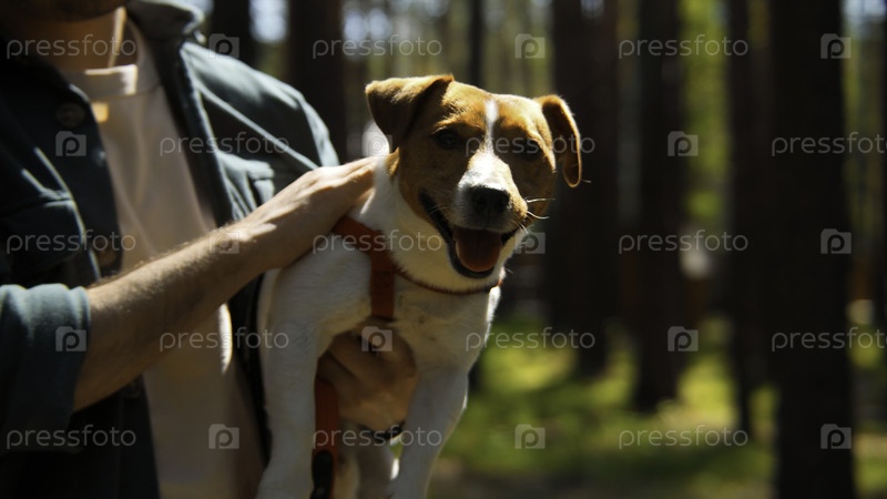 Портрет мужчины, держащего и поглаживающего собаку счастливого Джека Расселла на зеленом лесу и траве