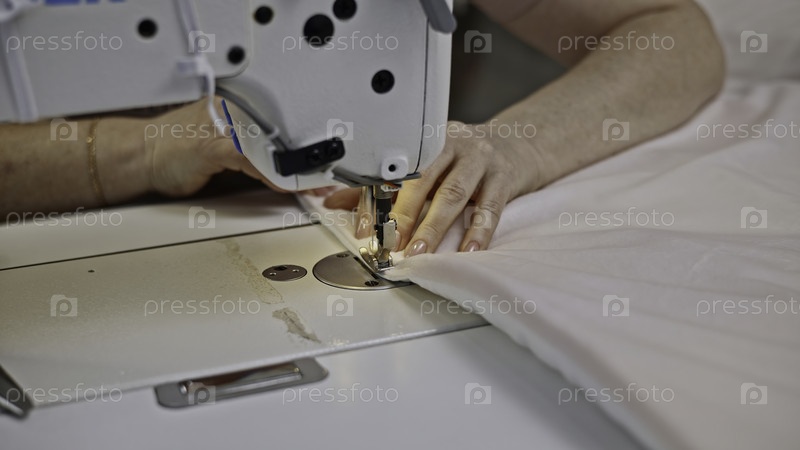 Близкий снимок швеи, шиющей белый подушечный чехол на фабрике СМИ Женские руки при работе по пошиву