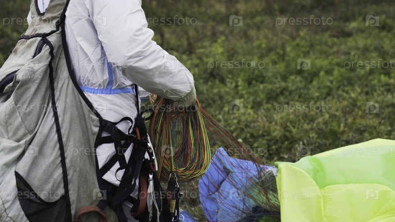 Человек с парашютом на земле. Акция. Близкий план мужчины в комбинезонах, собирающего веревки из парашюта после посадки. Мужчина бегает с парашютом после прыжка. Экстремальные виды спорта и прыжки