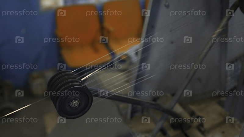 Металлические нитки вращаются на промышленных машинах.Креативные.Вращающиеся валы с металлическими нитями на металлургических заводах.Производство металлических проводов