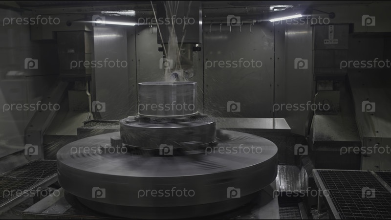 Поворачивающийся токарный станок для обработки металлов с помощью воды. Сток-клип. Автоматизированная машина для обработки металла с CNC поворотным и гидравлическим питанием. Металлическая резка фрезерной машиной