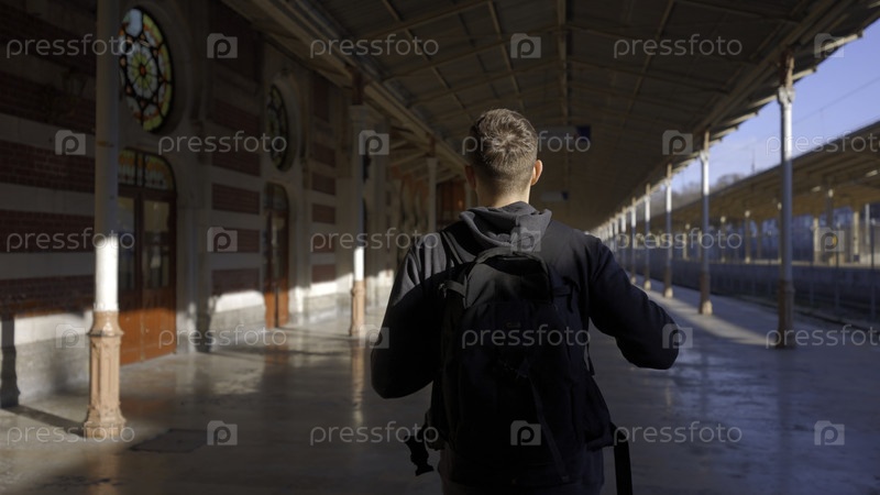 Молодой человек с рюкзаком, идущий вдоль пустой железнодорожной станции